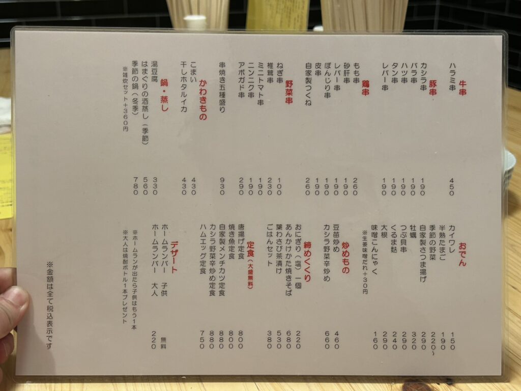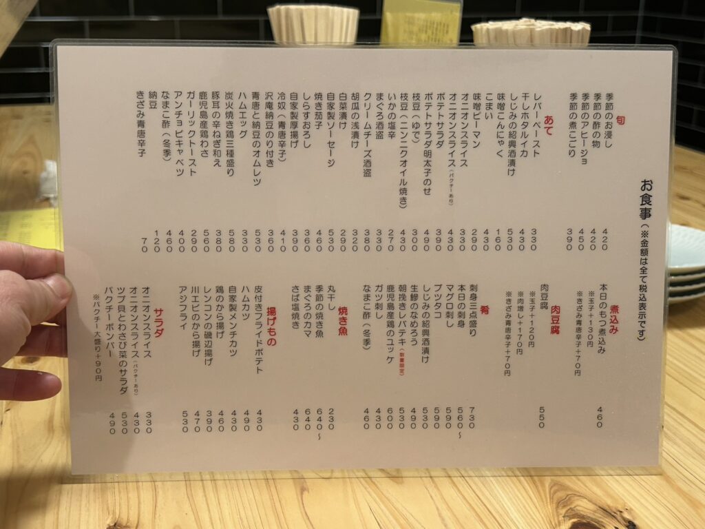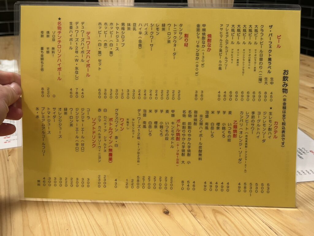 4社の大瓶ビールがそろっているのは珍しいのでは? しかもクラフトもあってビール党に優しい。割り材、カクテル、焼酎もさらっと載っているけどこだわりが見られるし、チンチロやボトルキープがあるのも嬉しい。そしてソフトドリンクの価格が手頃。