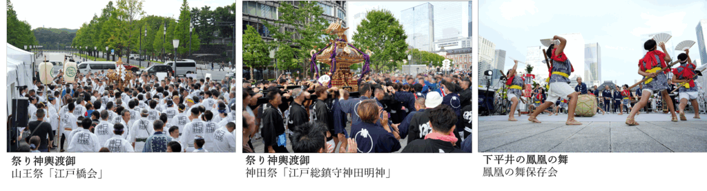 日枝神社“山王祭”から「江戸橋会」、江戸総鎮守神田明神“神田祭”から「神社神輿」が登場。江戸の天下祭として知られる2つの祭りの神輿が行幸通りで共演。特設ステージでは、ユネスコ無形文化遺産「風流踊」のひとつ「下平井の鳳凰の舞」などが披露され、東京で受け継がれる伝統と江戸文化の奥深さを伝えた。