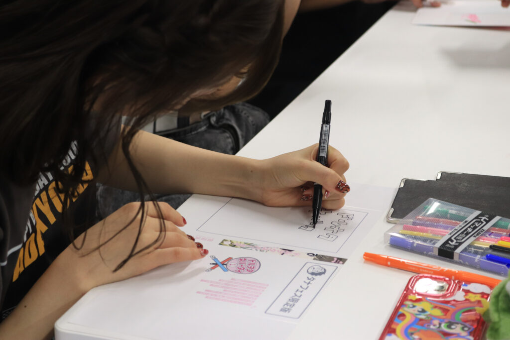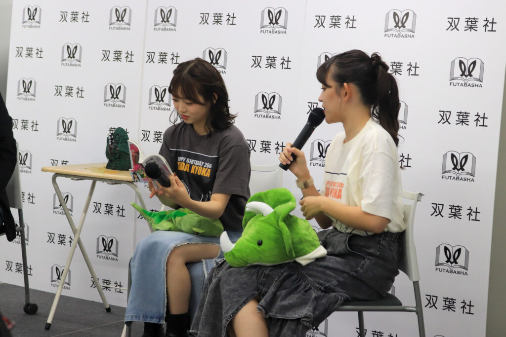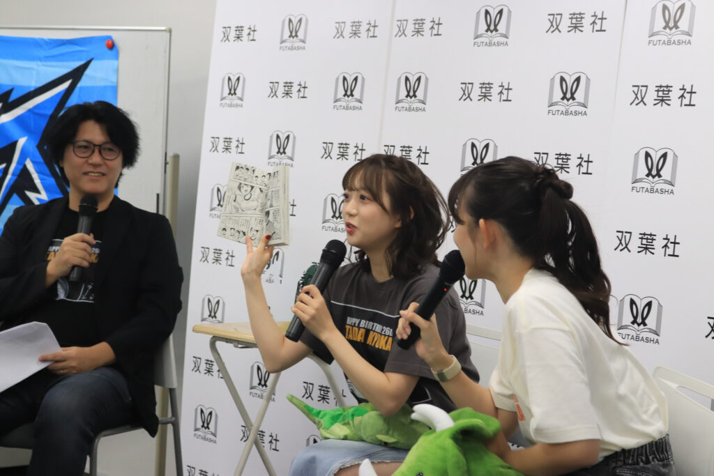 ステージ上で初めて『ドルヲタネバーダイ』を読んだ2人。たまたま開いたページが巨乳のキャラを男子がからかうシーンだったことから、「よくないページがあった!」「気まずページがあった!」とキャッキャする。先生が「主人公が大人になってアイドルを推していたのは、学生の時に思いを伝えられなかった初恋の子の影を追っていたから」と説明すると、多田さんは「ははあ〜〜〜!」と大きく頷き、ナイスリアクションを見せた。